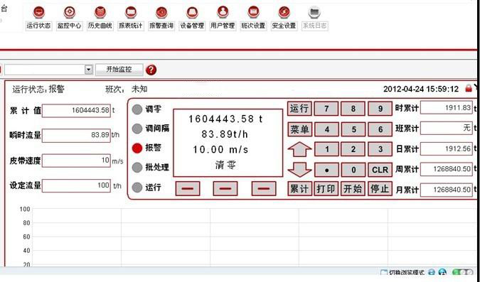 称重桥架安装于输送机架上,当物料经过时,计量托辊检测到皮带机上的物料重量通过杠杆作用于称重传感器,产生一个正比于皮带载荷的电压信号。速度传感器直接连在大直径测速滚筒上,提供一系列脉冲,每个脉冲表示一个皮带运动单元,脉冲的频率正比于皮带速度。称重仪表从称重传感器和速度传感器接收信号,通过积分运算得出一个瞬时流量值和累积重量值,并分别显示出来。