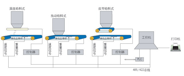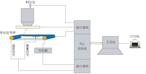圆盘给料机或其它上位输送机输送物料到单机皮带秤,单机皮带秤的重量信号,速度信号通过接口模块或PLC可编程控制器,送至工控机,由系统软件进行处理和显示,同时,利用PLC中的PID调节功能并根据用户设定的PID参数及理想控制值,通过PLC迷你量输出模块输出4~20mA电流到电机控制器,并由其调节给料机速度快慢,从而达到控制给料量的目的。