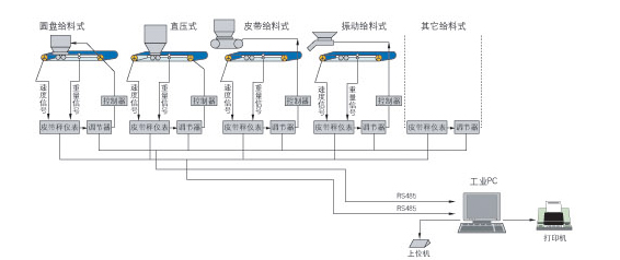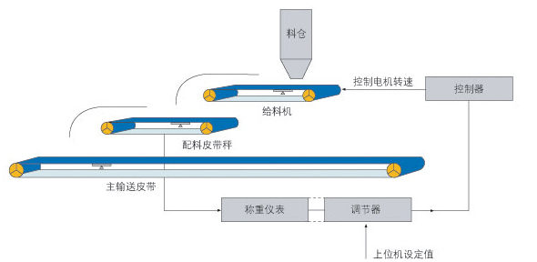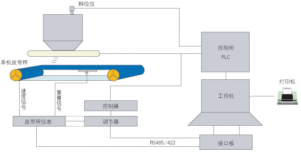 圆盘给料机或其它上位输送机输送物料到单机皮带秤,单机皮带秤的重量信号,速度信号进入积算器,并在积算器内部进行处理和显示,同时,输出与流量成正比的4~20mA电流信号都智能调节器,调节器根据用户设定的PID参数及理想控制值,输出4~20mA电流到电机控制器,并由其调节给料机速度快慢,从而达到控制给料量的目的。