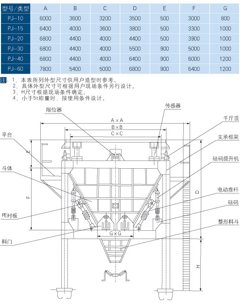 可根据现场环境条件,设计料斗体部分,料斗可为方形,圆形或异形;